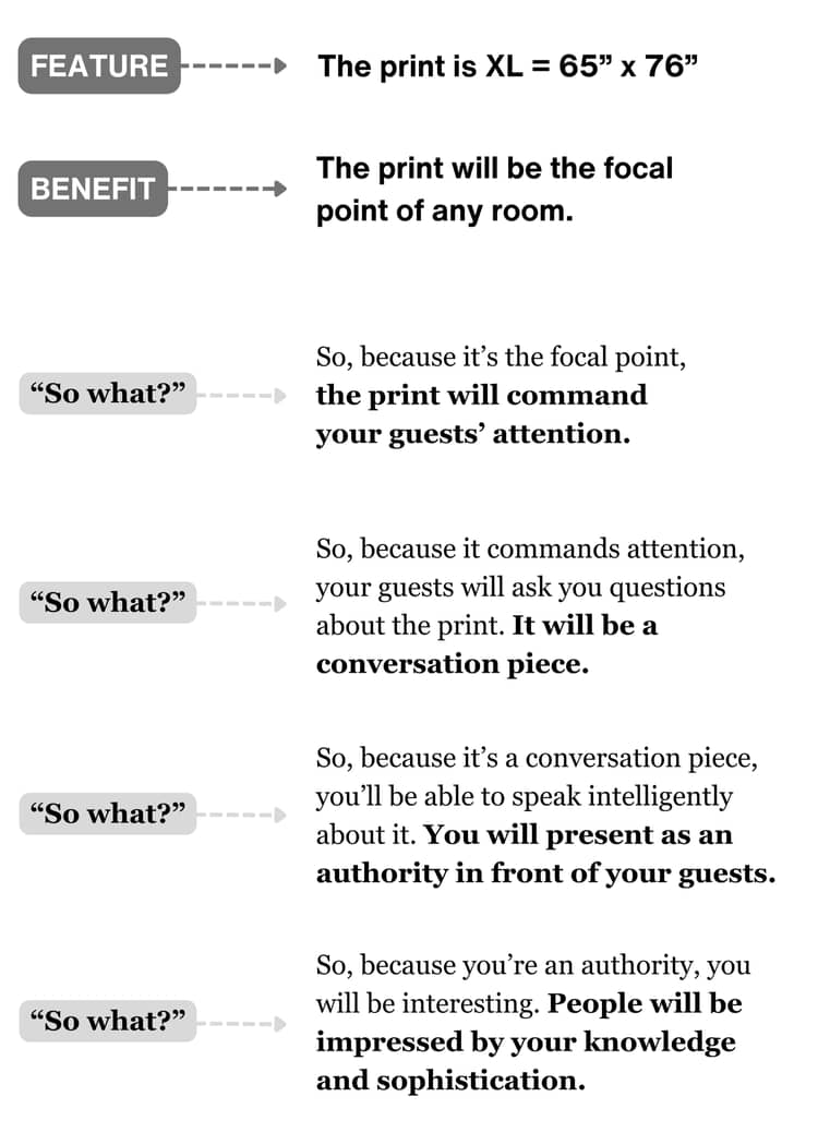 Every time you ask and answer this question, you’ve added a dimension to your benefit. And if you keep drilling—if you keep asking yourself, “So what?” over and over—you’ll eventually arrive at the feature’s core benefit, the thing your prospect truly desires, consciously or otherwise.
